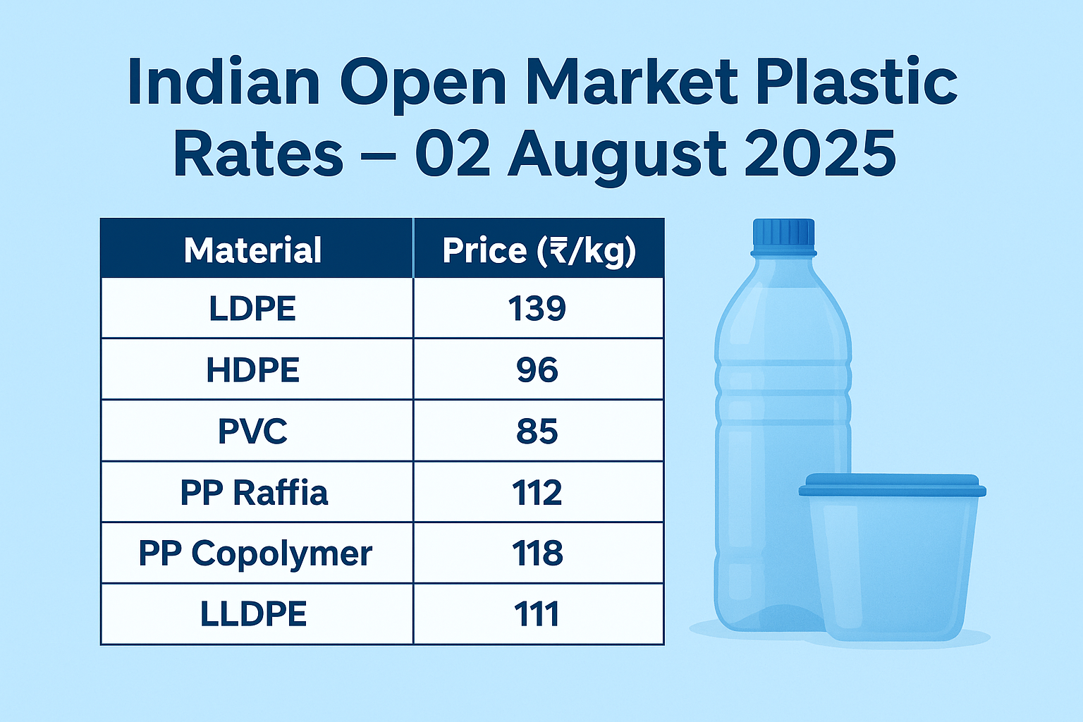Note: The open market prices (basic prices) for all regions, except Kolkata and Patna, are exclusive of GST. The open market prices for Kolkata and Patna are inclusive of GST. All prices are in INR/kg. Indian Open Market Plastic Rates – August 02, 2025 Product Kolkata Bangalore Indore Chennai Rajasthan Kanpur Hyderabad Punjab Kerala Patna … Read more